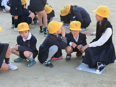 お題を朝礼台の後ろに代表の6年生が見に行き、各班のAチーム、Bチームに分かれて、言葉を伝言していきます。最後にいる6年生がその言葉を解答用紙に書き、全問正解を目指します。