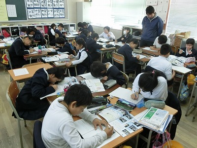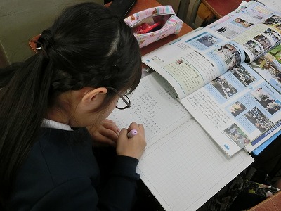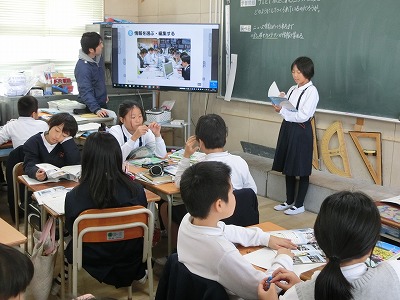 今日は、「ニュース番組はどのようにしてつくられるのか」について学習していました。子どもたちは、教科書や資料から「情報」を集め、まとめ、発表していました。