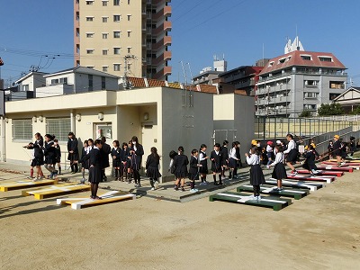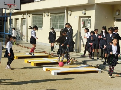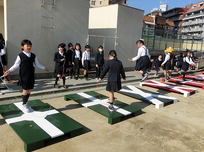休み時間になると、子どもたちは真新しい「ジャンピングボード(なわとび台)」へダッシュです。