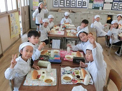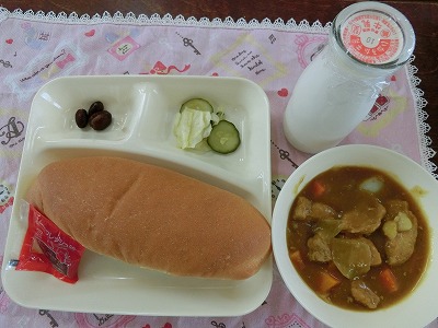 豚肉と野菜のカレー煮は、酢豚に入っているような角切りの豚肉に、じゃがいも、にんじん、玉ねぎの野菜が入っていました。スパイスが効いていて低学年さんにはちょっぴり辛かったかも・・・・。パンをカレーにつけて食べている子、カレーパンのようにはさんで食べている子もけっこういました。