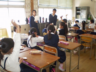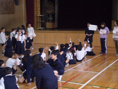 編成は、全16班編成で、1班(約30人)をさらにA・Bの2グループ(約15人ずつ)に分けています。各班には6年生を中心にリーダーと副リーダーをおき、今日は、自己紹介、班のめあて(目標)決め、名刺交換ゲーム(事前に各自が名刺大のカードに名前やイラストなどを書いたものを交換)、集会時の並び方などをしました。