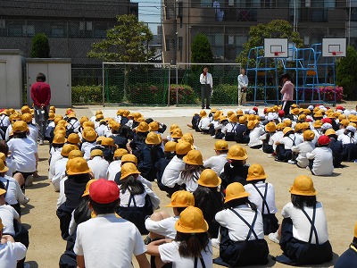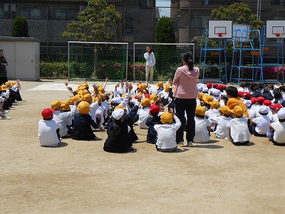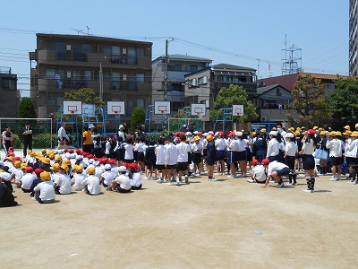 1回目の非常ベルと緊急放送で、避難準備をして教室待機、2回目の非常ベルと緊急放送で、出火場所より離れた運動場の砂場前に集合です。