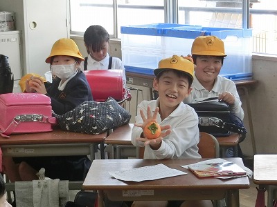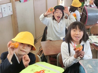 6時間の授業が終わって、終わりの会。先ほど収穫した「柿」を教室へと運びました。