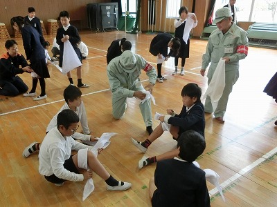 三角巾を汚さずに折りたたむ方法、腕を負傷した場合の使い方、足を負傷した場合の使用法を教えていただきました。
