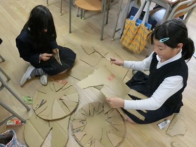 丸くカットした段ボールの周辺に、三角形にカットした様々な大きさの段ボールを貼りつけていました。この後、花びらのように外側に開けるそうです。