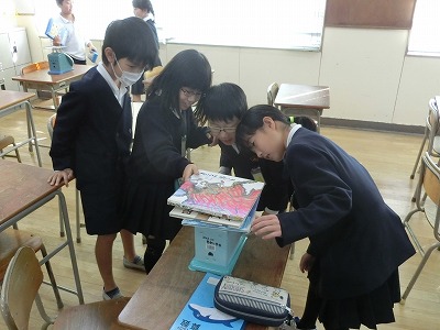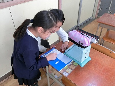 今日は1000gまで量ることのできる「はかり」を用いて、目盛の読み取りを覚えたり、筆箱などの身近な物の重さを量ったりしていました。