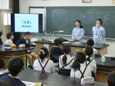 4年生が、飲料メーカーのSUNTORYよりゲストティーチャーをお招きして、水育(みずいく)学習を行いました。