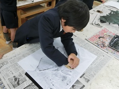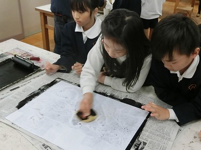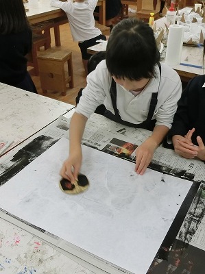 以前にも「版」の制作過程を紹介しましたが、作品展の取り組みで、このクラスでは、モンスターの制作と平行して、今日は、図工室で印刷をしていました。