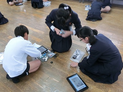 先生から作業工程を示されたデータをタブレットに送信してもらい、そのスライドを順に見ながら、2人で協力してブロック型のロボットを作り変えていきました。