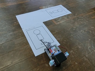 昨日はロボットの改造をしたのですが、今日は3組さんで「スタート→まっすぐ進む→左(または右)に90度方向転換→まっすぐ進む→ゴール枠内で停止」という課題に挑戦です。