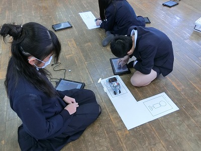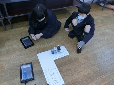 ずっと曲がったまま、曲がりすぎ、元に戻らない、進み過ぎ、距離が足りない、など、子どもたちはかなり苦戦していました。でも、決してあきらめてはいません。誰もが一番に課題のクリアを目指し、ペアで相談を重ね、最適なプログラムを探していました。