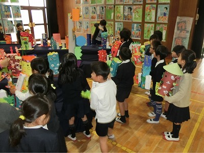 先生の指示に従って、子どもたちは、作品を教室から講堂へ慎重に運び入れました。