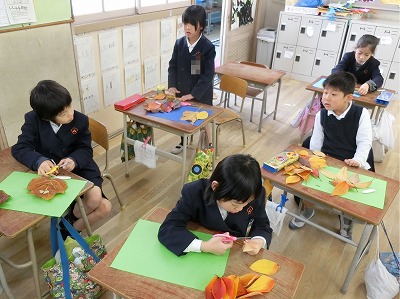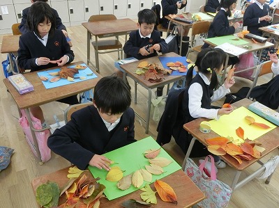 このクラスでは、4時間目の冒頭、子どもたちが正門付近や芝生広場で、様々に色づいた落ち葉を集めていました。