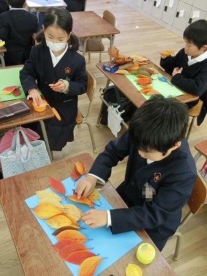 落ち葉をそのまま使ったり、手でちぎったり、はさみで切ったり、一部、色画用紙を用いたりして、水のりで貼りつけていき、秋らしい作品に仕上がっていました。