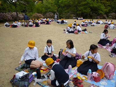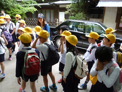 アニー先生の授業を生かして、「hello」と5年生の最後尾の児童たちはあいさつをしていました。