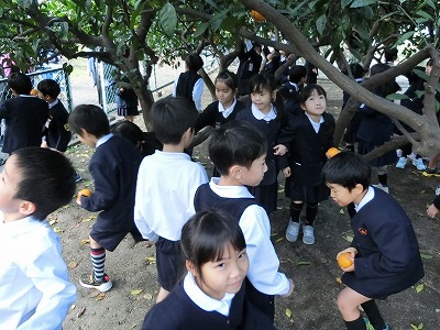 「どれが甘そうかな〜」と悩んでいました。高いところにあるみかんは、先生や管理作業員さんに採ってもらいました。