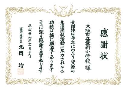 最後は、豊新小学校が長年にわたって、美化委員会さんが取り組んできた「毎週水曜日のアルミ缶の回収」について、東淀川区長様より「感謝状」をいただきました。