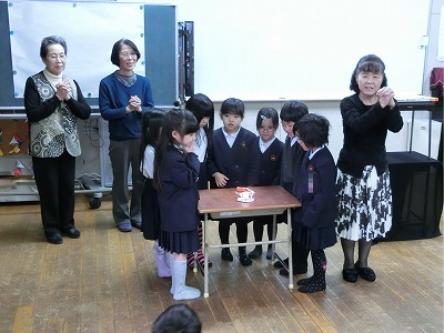 おはなし会の終わりには、おはなしのろうそくを消します。今日、12月4日が誕生日の子がいなかったので、12月生まれの子どもたちで、吹き消しました。みんなは心の中でお願いをしていました。