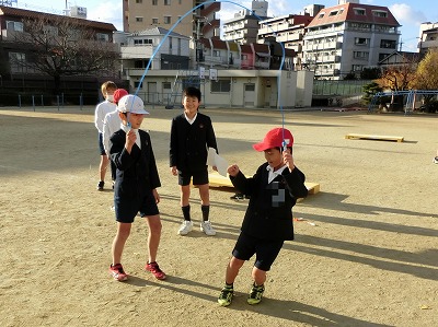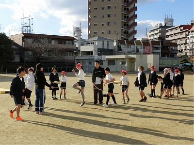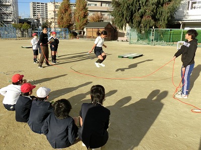 運動委員会では、全校児童の前での「なわとびの技」発表に向けて、運動場で練習です。