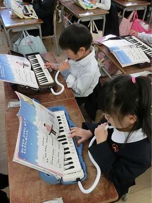 鍵盤ハーモニカを使って「きらきらぼし」を演奏していました。