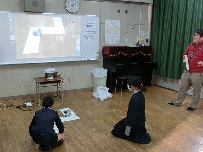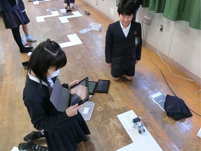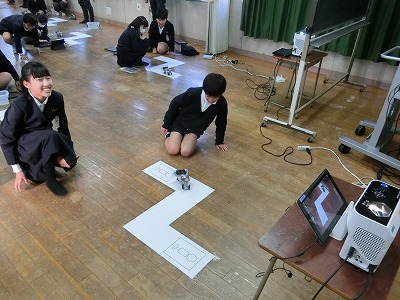 スタートして8分です。最初のペアがプログラムを完成させ、中継所(モニターで披露する場所)にやってきました。完ぺきなプログラムで、ゴール枠内にきっちりと停止し、みんなから歓声が上がっていました。その後、次々と、中継所で課題を完成させるチームが続出です。