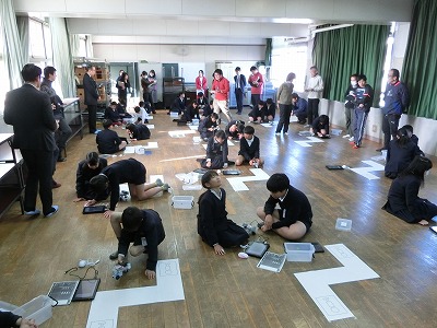 豊新小学校のすべての先生が多目的室に集まり、子どもたちはとても緊張している様子です。そんな中でも、難解な課題をクリアしようと、プログラミングに主体的に取り組んでいました。