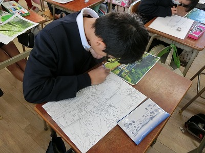 細かいところまで鉛筆で下書きし、その後、サインペンで描きなぞり、最後は水性絵具で彩色です。完成が楽しみです。
