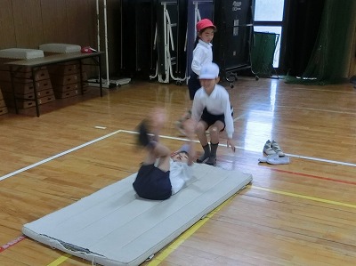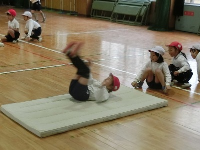 その後、グループごとに練習です。手の付きが悪く、どうしても横に(斜めに)回ってしまう子、回り終わった後に足を投げ出してしまい、どうしても立てない子、など、頑張って練習していました。