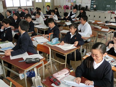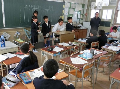 出題する班は前に出て、順番に考えてきた問題を読み上げ、答えがわかった児童が手を挙げます。答えは、教科書やノートなどを見てもいいそうです。