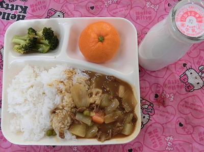 だいこん、れんこん、にんじん、にんにく、そして、玉ねぎ(なかなか気づかなかったのですが、英語にするとオニオンでした。)と、「ん」野菜がゴロゴロでした。それ以外には、うす切りの牛肉、グリーンピースも入っていました。お替りもたくさんの子がしてくれ、大盛りでおいしそうにいただいていました。