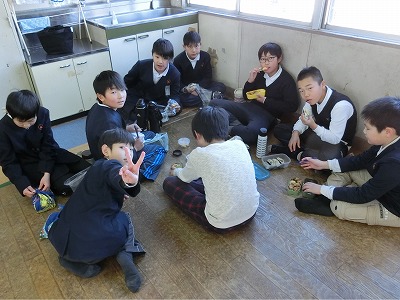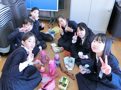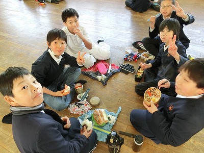 予定では工場近くの公園でお弁当を食べる予定でしたが、非常に寒い日となってしまったので、見学後は急いで学校に戻り、せっかくなので、雰囲気を出すために「多目的室」を使って、みんなでお弁当をいただきました。