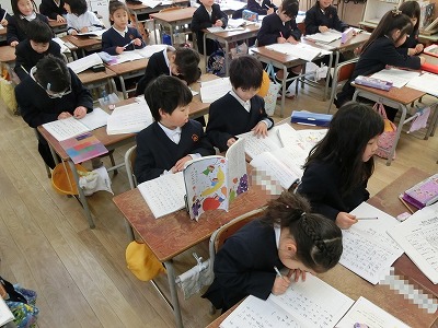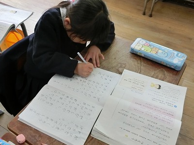 「おはなしを つくろう」という単元で、昔話をもとにして、自分だけのお話を作る学習です。自分が考えた人物が大きくなってどんなことをするのかを詳しく説明していきます。ノート見開きで2ページくらいの文章くらいなら、あっという間に書いてしまいます。