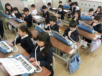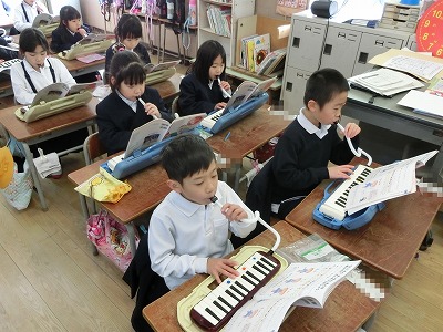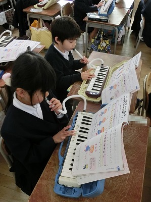 曲名は「とんくるりん ぱんくるりん」という曲で、こどもたちは楽譜の音符を見て、鍵盤ハーモニカを上手に演奏していました。「これくらいなら、へっちゃら」と言っていました。また、歌も、リズムに合わせて、大きな声で歌っていました。