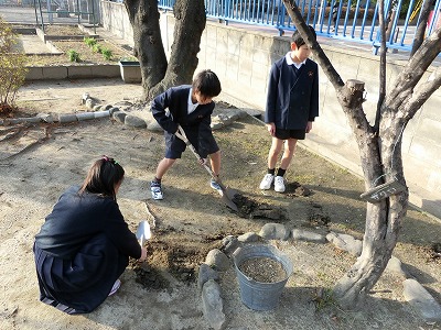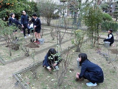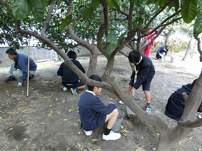 本校にはたくさんの果樹やバラ園もあり、毎年、この寒い時期に「飼育・栽培委員会」さんに手伝ってもらい「寒肥作業」を行っています。