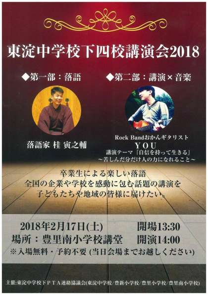 2月17日(土)に、大阪市立東淀中学校下四校PTA連絡協議会主催の講演会が開催されます。