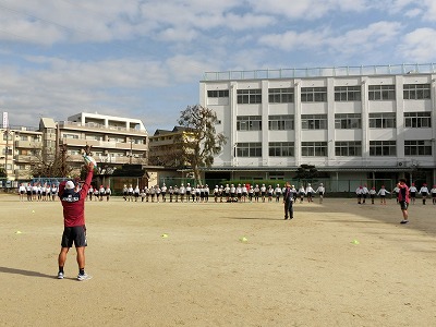 校舎側に横一列になり、手をつなぎます。選手がボールを上に投げている、手元が滑って地面に転がっているときは、前に進めます。ボールを手にした時にバランスを崩して動くとアウトでスタートラインに戻ります。