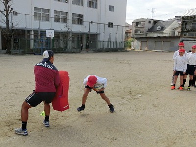 選手がタックル用のヒットバックを持って構えています。そこへ児童が、ボールを抱えたまま肩からタックルです。
