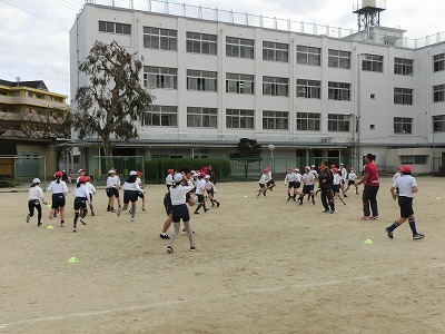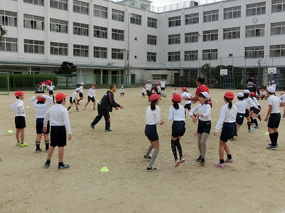 鬼は選手ですが、ボールを持った選手しかタッチできません。選手は巧みにパスをして、子どもたちにタッチをし、コート外へ出していきました。