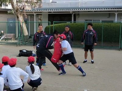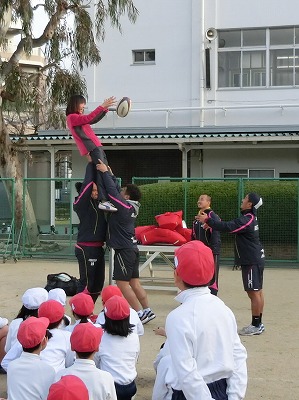 また、ラインアウトのときにボールをキャッチするための「リフト」も担任の先生に体験してもらいました。あまりもの高さに先生もビックリです。