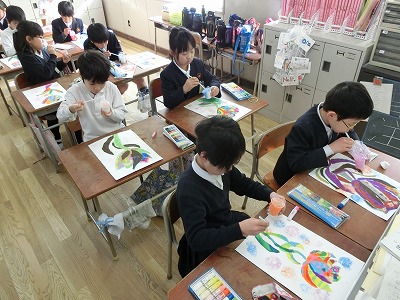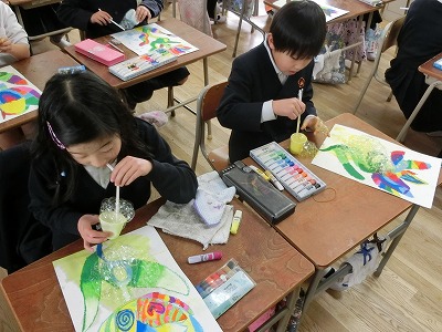 子どもたちはすでに、とってもカラフルな「チューリップ」の絵をパスを使って描き上げています。