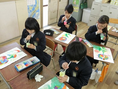 紙コップには、水彩絵の具で薄く色を付けた色水が入っています。