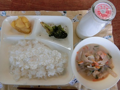 かす汁は、小学校給食ですが「酒かす」を使用しています。十分に加熱してアルコール分を飛ばしていますのでご安心ください。鮭、大根、ニンジン、うすあげ、こんにゃく、青ネギが具材でした。