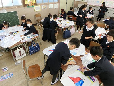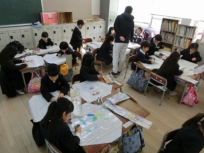 凧は白いビニル製のもので、すでに出来上がっています。1・2時間目に、マジックを使って思い思いのデザインを描いていました。