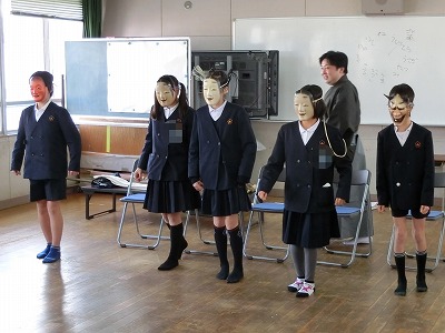 女の人、般若、鬼の能面を見せてもらいました。般若は女の鬼で、男の鬼は角のない面です。一般的な鬼の角があり虎の皮の衣装というのは、鬼門が北東(丑寅)の方向で、牛の角と虎の皮からきているそうです。