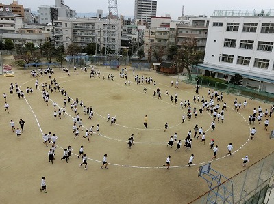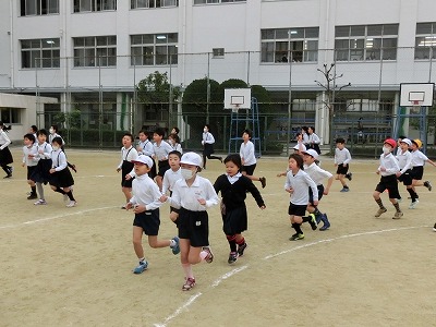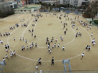 1限後の10分間の休み時間に運動場に出てきて、トラックの内側を低学年、トラックを中学年、トラックの外側を高学年が、準備運動の後、それぞれのペースで走ります。