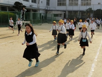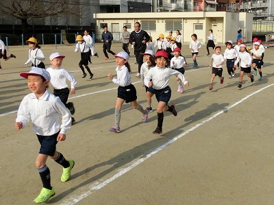 昨日は、2・4・6年生が走っているのを、2階の廊下から見ていた「1年生」ですが、今日から初参加です。今日は1・3・5年生の日です。