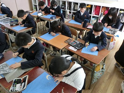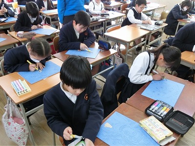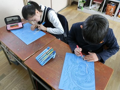 さすがに5年生です。まだ序盤ですが、上手に彫刻刀を扱い、細かく、複雑な箇所もきれいに彫り進めていました。また、彫る場所によって、彫刻刀の刃先を使い分けてもいました。