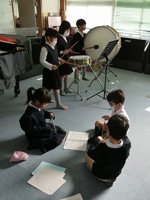 鍵盤ハーモニカを中心に、大太鼓、小太鼓、鉄琴、トライアングルに役割分担し、ミュージカル『アニー』の「Tomorrow」を繰り返し練習していました。