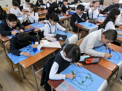 4年生は木版画です。今日は来週からの彫り作業のために、下絵の完成を目指していました。題材は「自画像」です。なかなか、上手くポイントがつかめていて、見ている私も、思わず笑顔になりました。