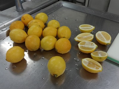 17個のレモンを半分に切って絞り器にセットし、力を込めて絞った後、もったいないので、調理員さんがさらに手で新鮮な果汁を絞り取りました。最後の一滴までていねいに絞り切りました。